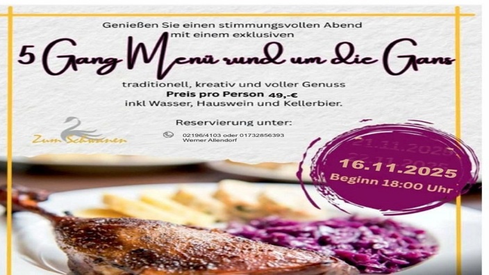 30.09.2025 Senioren-Union Wermelskirchen: Menü rund um die Gans Die Senioren-Union Wermelskirchen lädt am 16. November 2025 um 18:00 Uhr zum traditionellen "Menü rund um die Gans" ins Restaurant "Zum Schwanen"...